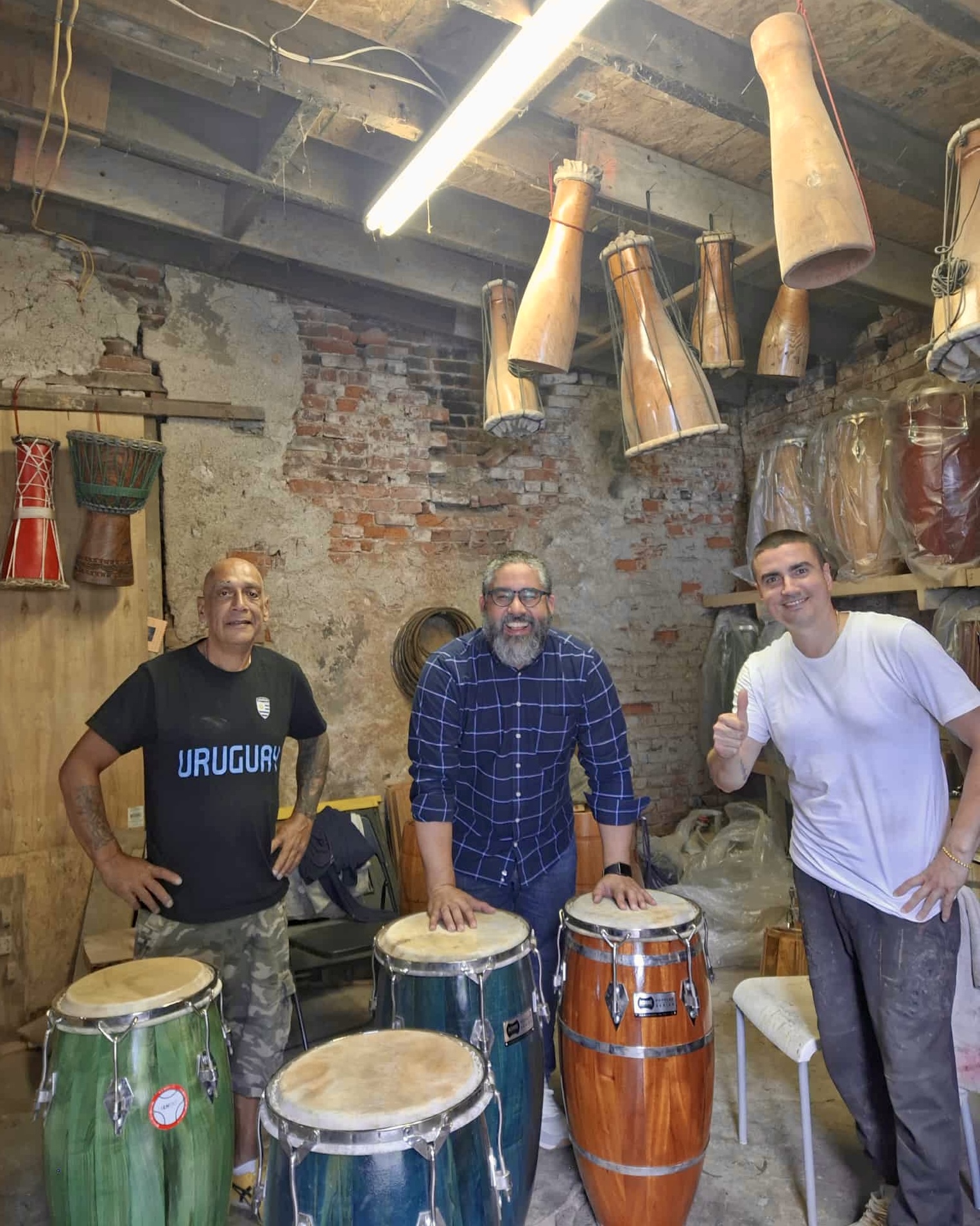 Ya a Christian lo había conocido en 2019 durante una visita a Filadelfia, donde nuestro amigo en común, el percusionista venezolano Andrés Cisneros, nos juntó en una descarga en la casa del percusionista cubano Arturo Stable, un espacio donde hacían conciertos íntimos. Allí hubo guaguancó, latin jazz, salsa y tambores batá. Desde ese momento conectamos en redes sociales y vi la evolución hacia la creación de Acheré Percussion en 2021. Una sensación similar sentí con El Tongo, cuyo nombre de pila es Esteban Hernández, pues nos abrazamos como si ya fuéramos amigos. También conocía su trayectoria como artesano a través de las redes, por lo que aquel junte ya tenía mucho trasfondo y expectativas.